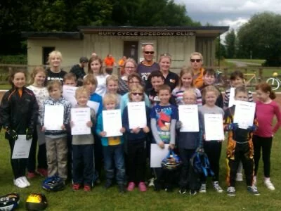 All the riders (pictured above) received certificates, arm bands and water bottles courtesy of British Cycling, with guest Alex Scoular, North-West regional manager, attending and being persuaded to take part in a race after the event where he got the perfect "flyer " and hurtled into the first bend in the lead, only to be passed by the other